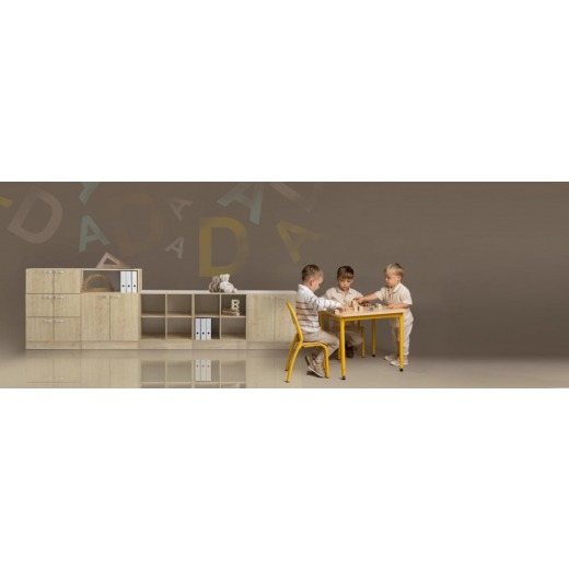 sedie e tavoli per la scuola, panche per il guardaroba, mobili per la sala di giochi, mobili per la mensa, mobili contenitori, mobili modulari, armadi, scaffalature, armadietti per asili, armadietti a caselle